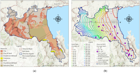Notably, in RCP4.5, the simulated nitrate concentrations present both the highest and lowest nitrate concentrations at the central coastal part. This is attributed to the heterogeneous hydrological conditions and hydraulic conductivity of the coastal area. In the northern coastal part, the geological formations consist of highly permeable materials of sand and gravel, while from the central part to the south, clayish formations that form slower groundwater flows than in the northern part start to appear. The increasing uncertainty of nitrate pollution according to each climatic model is also verified in the results in Sections BB’ for both climatic scenarios RCP8.5 and RCP4.5.