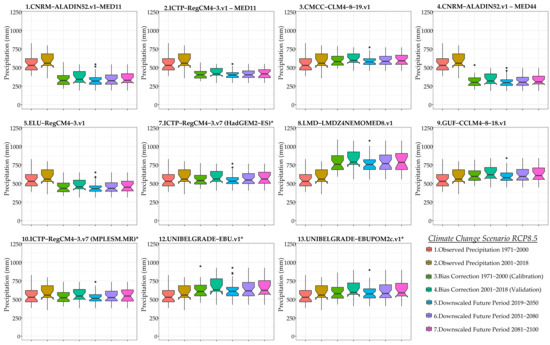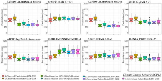 Figure 4 illustrates Box-Whisker plots for mean annual precipitation under the RCP4.5 scenario, for each bias-corrected climatic model with Quantile Empirical Mapping. The results indicate that the bias-corrected models 1.CNRM-ALADIN52.v1 (MED-11), 4.CNRM-ALADIN52v1 (MED-44), 5.ELU-RegCM4-3v1, 6.ICTP-RegCM4-3v4*, 11.ENEA-PROTHEUSv2* underestimate the historical annual precipitation. The models 3.CMCC-CCLM4-8-19v1, and 8.LMD-LMDZ4NEMOMED8v1 overestimate the historical annual precipitation. The only model that accurately estimates the historical annual precipitation is the 9.GUF-CCLM4-8-18v1. However, all bias-corrected models present similar decreases in annual precipitation of the future periods 2019–2050, 2051–2080, and 2081–2100.