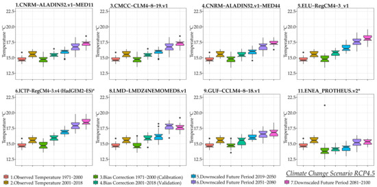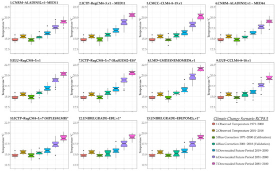 Figure 5 presents Box–Whisker plots for bias-corrected and downscaled mean annual temperature under the RCP8.5 scenario. Regarding the historical observed periods 1971–2000 (calibration period) and 1991–2018 (validation period), there is a minor increase in the mean value of annual temperature and, respectively, the notches change. The notches’ ranges do not overlay hence, the medians are statistically different. The notch of the period 1971–2000 indicates the interquartile range of the timeseries (50% of the data) and a relative asymmetry of the spread of the timeseries of the period towards the lower values, which means that there were more years of low annual temperature of this time period. On the contrary, the symmetrical shape of the time period 2001–2018 indicates the increase in the number of years with increased annual mean temperature. The results show for the calibration period that the bias-corrected climatic models 3.CMCC-CCLM4-8-19v1 and 9.GUF-CCLM4-8-18v1 are in excellent agreement with the mean and variance of the historical annual temperature timeseries. The bias-corrected climatic models 4.CNRM-ALADIN52v1, 10.ICTP-RegCM4-3.v7*(MPI-ESM-MR), and 13.UNIBELGRADE-EBUPOM2cv1* also show a robust fit for mean annual temperature.