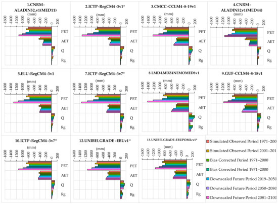 Potential evapotranspiration is projected to increase significantly in the RCP8.5 climatic scenario post-2051, while RCP4.5 indicates a milder upward trend. In RCP8.5, 1.CNRM-ALADIN52.v1 (MED-11) consistently projects high PET, notably increasing from 1991–2000 to 2081–2100. Models 2.ICTP-RegCM4-3v1* and 5.ELU-RegCM4-3v1 shows upward PET trends. While 9.GUF-CCLM4-8-18v1 and 12.UNIBELGRADE-EBUv1* also projects rising PET; there are fluctuations. In RCP4.5, PET generally increases across models, with 1.CNRM-ALADIN52.v1 (MED-11) and 3.CMCC-CCLM4-8-19v1 consistently shows higher values, but 11.ENEA-PROTHEUSv2* deviates with a decrease in PET during 2019–2050. Similar to potential evapotranspiration, AET demonstrates an increasing trend, notably higher in RCP8.5. Under RCP8.5, 8.LMD-LMDZ4NEMOMED8v1 and 9.GUF-CCLM4-8-18v1 consistently project increased AET from 1991–2000 to 2081–2100, with 8.LMD-LMDZ4NEMOMED8v1 displays the highest values. Models like 3.CMCC-CCLM4-8-19v1, 12.UNIBELGRADE-EBUv1*, and 13.UNIBELGRADE-EBUPOM2cv1* also shows rising AET, indicating high evapotranspiration. In RCP4.5, similar trends persist, with 8.LMD-LMDZ4NEMOMED8v1 projecting the highest AET values, while 3.CMCC-CCLM4-8-19v1 and 9.GUF-CCLM4-8-18v1 exhibit increasing AET. However, the 11.ENEA-PROTHEUSv2* model shows fluctuations and 1.CNRM-ALADIN52.v1 (MED-11) and 4.CNRM-ALADIN52v1 (MED-44) models present the lowest AET values, with other models displaying a milder increasing trend in AET.