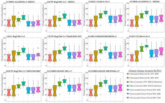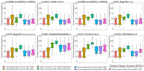 Figure 10 under RCP4.5. In examining the box plots depicting nitrogen leaching over different climate change periods, it is observed that nitrogen leached towards the aquifer follows the temperature change, although no simple statistical correlation between temperature and nitrogen leaching is established. Regarding the historical observed periods 1991–2000 (calibration period) and 1991–2018 (validation period), the mean value of annual nitrogen leaching remains stable, but the variability expands during the simulated observed period 2001–2018 and, respectively, the notches change. However, the notches’ ranges overlay, hence, the medians are not statistically different. Particularly, for the observed simulated base period 1991–2018, 40% of total annual nitrogen fertilization is leached towards the Almyros aquifer system, which approximates the average annual value of 42.7 kg/ha of nitrogen.