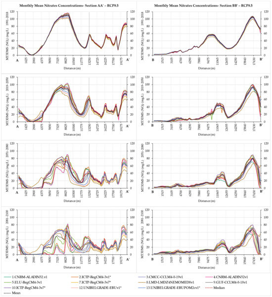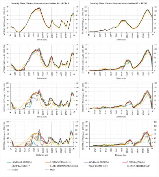 Figure 12, the sections AA’ and BB’ for the eight bias-corrected climatic models are displayed for the medium impacts scenario RCP4.5. Observing the sections of the results derived from the MT3DMS simulations for the nitrate concentrations, it is noticed that there is a general consensus among the climatic scenarios and climatic models for the historical period of 1991–2018. The results initiate present differences and variability, especially in the areas of increased nitrate concentrations as time progresses into the future until 2100.