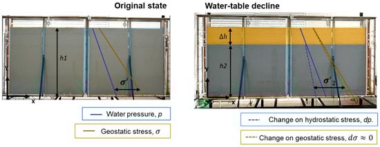 Figure 1 illustrates the decline of the water table in an unconfined coastal aquifer, considering the effects of land subsidence and the interaction between the hydrostatic (p) and geostatic stresses (σ). Figure 1 also depicts that the water table is in a constant state and the hydrostatic stress and geostatic stress are not altered, showing a constant effective stress (σ’), and after the water exploitation occurs, and the hydrostatic stress is lowered, changing the geostatic stress, and increasing the effective stress.