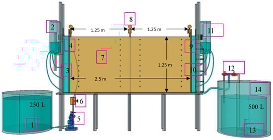 Experimental setup for land subsidence experiments. 1. Left-side reservoir, 2. Left-side chamber for water level control, 3. Left-side compartment, 4. Lateral mesh, 5. Inlet pump, 6. Ball valve, 7. Central compartment with porous media, 8. Vertical displacement transducers, 9. Lateral mesh, 10. Right-side compartment, 11. Right-side chamber for water level, 12. Ball valve, 13. Inlet pump, and 14. Right-side reservoir.