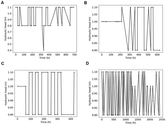 where is the hydraulic head at the boundary variating over time. Figure 3 shows the recreated scenarios; fine sand with the first scenario (A) and second scenario (B), and coarse sand with the first scenario (C) and second scenario (D). The variation of the hydraulic head over time represents the change of the water table level in the left- and right-side compartments used to recreate the cycles of exploitation and recharge.