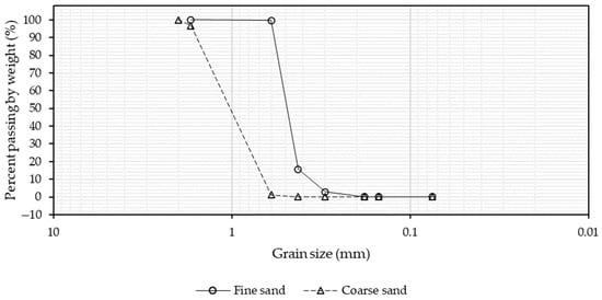 Two types of sand were analyzed for this research, namely coarse sand with an average particle diameter of 0.67 mm, also known as 12–20 grade sand, and fine sand with an average particle diameter of 0.39 mm, known as 30–40 grade sand, to analyze its vertical deformation after each cycle of exploitation and recharge. The experimental methodology followed the approach for the vertical deformation of sand suggested by Li et al. [28], where the vertical deformation was measured after each cycle of exploitation and recharge. Furthermore, the experimental findings were applied for the development of a numerical model coupling Navier–Stokes equations for groundwater flow and Terzaghi’s law.