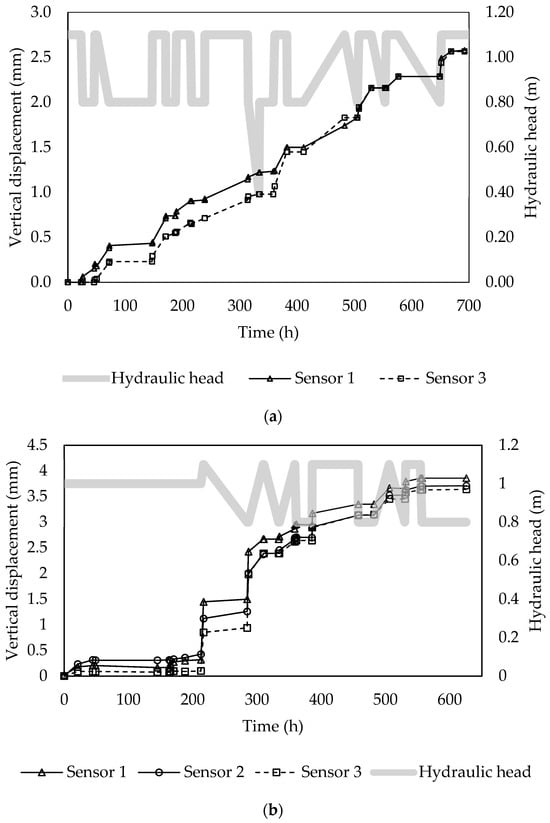 Figure 5 depicts the vertical deformation of the coarse sand in two scenarios of water exploitation and recharge. The cycles are depicted with gray bars; the hydraulic head was changed with continued cycles of water tables of 1.1 m and 0.8 m. The first scenario depicted in Figure 5a showed an average maximum total displacement of 2.57 mm after 19 cycles and 692 h while the second scenario depicted in Figure 5b showed a maximum vertical deformation of 3.7 mm after 625.4 h and 15 cycles. The second scenario had a constant hydraulic head from 0 to 200 h; during that time, there was no vertical deformation. After the first cycle of exploitation was recreated, the vertical deformation increased, as observed after 200 h of the experiment.