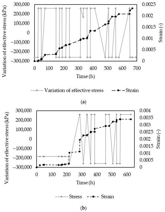 The strain slope for scenario 1 remains relatively constant over time, indicating consistent exploitation and recharge levels. However, a notable change in slope occurred after 315 h when the hydraulic head was reduced to 0.4 m (as shown in Figure 6a), increasing the strain slope. For scenario 2 (Figure 6b) the strain initially exhibited an average constant value of 1.8 × 10−4 up to 212 h, corresponding to a steady water level of 1 m. Upon the beginning of the first exploitation, the water level decreased to 0.8 m, causing the strain to increase to 1 × 10−3. The strain then remained constant as long as the water level was maintained and subsequently increased to 2 × 10−3 after the second cycle of exploitation. After the second cycle starting at 358 h, the strain slope remained stable, leading to progressive vertical deformation of the soil with each consequent cycle of recharge and discharge until reaching a maximum average strain of 3.4 × 10−3.