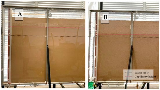 The fine sand scenarios showed a decrease in the rate of subsidence, with a vertical displacement that occurred mostly because of a delayed response to water table changes. The cycles of recharge and discharge for the fine sand were conducted in the same manner as with the coarse sand; however, the capillarity forces with the fine sand held more saturation than the coarse sand after the water table was lowered. Figure 7 shows the location of the capillarity fringe when the water table is fixed at 0.8 m for side A with the fine sand, and side B with the coarse sand. The capillary fringe occurs when a percentage of saturation is trapped in the micropores of the sand, depending on whether the porosity is high or low. Sands with a higher porosity have less capillary force than finer sands [53].