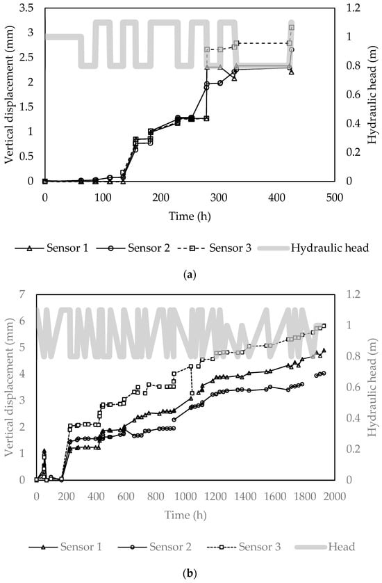 Along the different periods, the vertical displacement showed a close increase in subsidence over time. The simulation shows a constant slope of compaction, but for the experimental case, periods with low to no compaction were observed. This was evidenced in the first scenario after 200 h and at 300 h again, with constant cycles of exploitation and recharge, and in the second scenario after 250 h and at 500 h. The late response of finer sediments has been evidenced by various studies [39,40,57] and one of its consequences is delayed land subsidence after the water head declines.