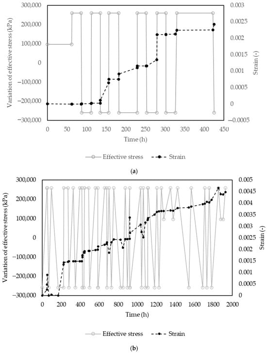 Figure 9a shows that for the first scenario of fine sand, the strain continued to increase when the stress was constant, and it did not rapidly increase with the change in effective stress. After the effective stress increased with the lowering of the hydraulic head at 156 h, and then recovered at 181.9 h, the change in strain reduced from 0.00109 to 0.0011. However, after this cycle and before the next exploitation, the strain continued increasing, evidencing the slower response of the vertical deformation after the exploitation cycles.