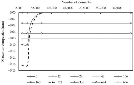 where , , , and , are the hydraulic conductivity in the vertical axis, the hydraulic head in the vertical axis, and the specific storage in terms of hydraulic head and the hydraulic head over time, respectively. Simulation with Terzaghi’s approach involves using the skeletal-specific storage or aquifer compressibility to calculate the vertical compaction (m) with Equation (21). This compaction is one-dimensional and follows a conventional flow model (Equation (9)). The results are used in post-processing to calculate vertical compaction based on Terzaghi’s theory [54].