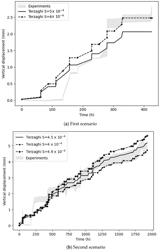 The specific storage that was better adjusted to the first scenario was 3.5 × 10−4 m−1 and for the second scenario was 9 × 10−4 m−1. The average absolute error between the numerical model results and the media of the experimental results for the first scenario was 0.14 mm, with the highest discrepancy when estimating vertical deformation at 668.9 h and 692.35 h of 0.31 mm and 0.317 mm, respectively. For the second scenario, the average absolute error was 0.34 mm with the highest discrepancy at 309.8 h with 0.93 mm.