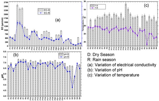 The field parameters showed a variability of values depending on the season. Figure 2 shows the results for temperature (a), pH (b), and electrical conductivity (c) in every sample point. The analysis of these results shows, on the one hand, a heterogeneity between the values of the conductivity according to the seasons and the sampling points (Figure 2a). Indeed, the electrical conductivity values of water decrease from the dry season to the rainy season and oscillate from 378 to 1443 µs/cm in the rainy season, and from 370 to 2575 µs/cm in the dry season for groundwater. On the other hand, for surface waters, this parameter evolves from 50.3 to 179.56 µs/cm in the rainy season, and from 95.75 to 542.5 µs/cm in the dry season. This variability can be explained by the contribution of ions by runoff and infiltration water during the rainy period. The seasonal variations observed are on the same order as those obtained by [52], a study carried out on River Benue water at Makurdi. A decrease in electrical conductivity in the rainy season would be linked to the dilution effect. On the other hand, there is a significant decrease in temperature from the rainy season to the dry season, with values that oscillate between 25.8 and 29 °C in the rainy season and from 28.5 to 35.7 °C in the dry season (Figure 2c). Between 10 and 30 °C, the temperature has only a negligible effect on the mobility of metals. However, in a mining environment, a water temperature higher than 30 °C could influence acid mine drainage (AMD) because it can accelerate the oxidation reactions of minerals [53]. The variation in temperature observed would be linked to the level of sunshine. Figure 2b also presents the variations of pH according to the seasons and the sampling points. Analysis of graph (b) in Figure 2 shows that pH is between 6.51 and 7.31 in the rainy season and 4.6 to 7.1 in the dry season. These results show that 26% of the samples in the dry season have a pH lower than 6.5, which represents the guideline value of the [54,55]. These waters are therefore acidic and can lead to the dissolution of metals [11]. Similar seasonal variations in pH and conductivity have been obtained by other researchers [37,56]. Therefore, key field parameters such as temperature, pH, and EC are influenced by seasonal changes and sample points in the study zone, which can have an impact on HM behaviour in the environment.
