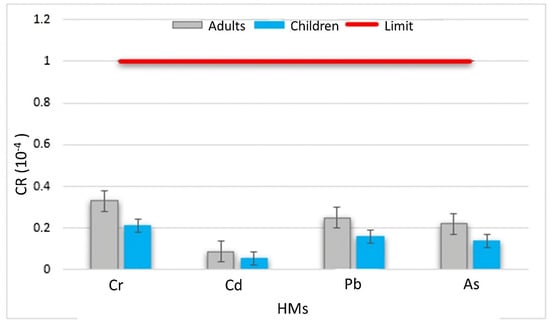 This index categorizes health risks into two types: HI < 1 indicates a low detrimental impact of HMs on human health, while HI > 1 represents greater chances of harmful health effects [12,27]. The carcinogenic risks (CR) of HMs were calculated to evaluate the chances of an individual developing cancer during their life span due to their contact with potential carcinogens. The slope factor (SF) is a toxicity value that describes the association between dose and response. Of the selected heavy metals, Cd, Cr, Pb, and As have significant cancer risks. SF (mg/kg/d) values are those used by [8] (Cr = 0.5; Cd = 15; Pb = 1.7; and As = 1.5). The CR was computed by: