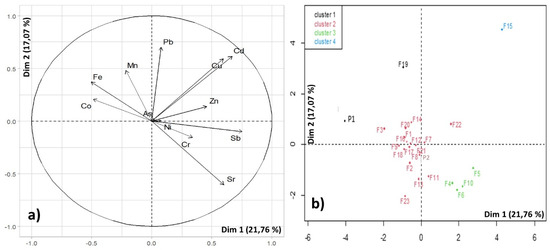 On the other hand, Figure 5b groups the sample points in relation to their characteristics. The samples that appear closer together exhibit a greater similarity in their HM composition, and, therefore are more similar in their environmental characteristics. It can be observed that HCA automatically differentiates between four distinct groups based on the sampling points. It is true that some sampling points coincide in the same group due to their proximity, such as F4, F5, and F6, indicating that in that area HMs are influenced by the same factors. However, other sampling points are close on the factor map but do not coincide in reality. This may be because different areas are affected by the same factors. Ref. [10] also conducted a factor map with their sampling points, and the dispersion of their points depended on the content of jarosite and carbonates in the soils, so analysing these compounds for future investigations could be interesting.