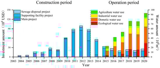 As shown in Figure 3, the total completed investment in the SNWDP from 2003 to 2020 amounted to USD 64.15 billion. The main facility, support facility, and sewage disposal projects accounted for 55%, 31%, and 13%, respectively. The peak investment period was 2010–2014, accounting for 61% of the total investments. Different regions had varying contents for the main projects. In the water-providing areas, the main projects included the construction of the Danjiangkou Dam, reservoir area resettlement, and cultural heritage protection, with a total investment of USD 7.73 billion. The main projects in the water-receiving areas include the construction of a trunk line, environmental protection, land acquisition, and resettlement, with a total investment of USD 23.4 billion. The main projects in the middle and lower reaches of the Han River, also known as governance projects, aim to reduce or eliminate the adverse effects of water diversion, with a total investment of USD 1.7 billion. Sewage treatment is the focus of pollution control projects, with a total investment of USD 8.2 billion and an average of approximately USD 0.45 billion annually. It was primarily concentrated in water-providing areas, east-route pollution control areas, and the middle and lower reaches of the Han River. The former two were mainly used to ensure the quality of water delivery, whereas the latter was mainly used to prevent pollution caused by sewage discharge after the downstream water volume decreased.
