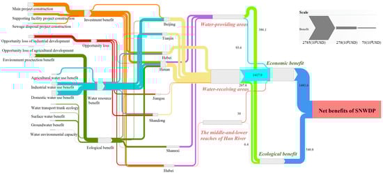 As shown in Figure 4, the net benefits of the SNWDP were USD 207 billion, encompassing economic and ecological benefits, accounting for 71.6% and 28.4%, respectively. With regard to economic benefit, a total of 96% of economic benefits are derived from water-receiving areas, primarily investment and water resource benefits. The total investment benefit is USD 79.5 billion, with an investment multiplier of 1.24. This indicates that with USD one billion of investment in the research area, the local GDP would increase by USD 1.24 billion. Among these, the region with the highest investment benefits is Hebei Province, totaling USD 24 billion, with an investment multiplier of 1.29. This is consistent with the research by Tang et al. [59], who found that the multiplier of water conservancy investment on GDP is approximately 1.3. The total water resource benefit is USD 99.8 billion. Beijing has the highest water resource benefit of USD 30.5 billion, with a per-unit cubic meter water resource benefit of USD 4.6, which is higher than the result (USD 3.6) of Yang et al. [27]. The main reason is that, with advancements in technology and management tools, the water consumption per unit value added has gradually reduced, increasing the value per cubic meter of water.