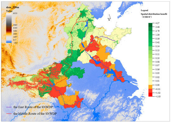 To observe the spatial distribution of the SNWDP’s comprehensive benefits across different regions, we combine the various benefits with the area of land use type. For instance, the advantages of water used for industrial production and urban domestic use correspond to the built-up land areas, whereas water used for agriculture corresponds to the extent of cultivated land. Ecological benefits related to forests, water bodies, and other factors were distributed across the corresponding land areas. Benefits that did not significantly affect specific land types, such as investment benefits and underground water benefits, were considered to occur throughout the administrative area. This approach enabled us to derive the spatial distribution of benefits per unit area within the SNWDP study area.