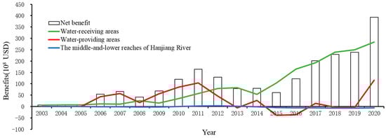 Regarding the water-receiving areas, the overall benefit showed an upward trend, with an average annual growth rate of 252%. After entering the operational period, the benefits were primarily driven by water resources. Although the volume of water diversion increased from 0.78 billion cubic meters in 2014 to 9.3 billion cubic meters in 2020, there is still some distance to cover to reach the planned value. Therefore, water resource benefits are likely to increase. Moreover, there was significant variation in unit water benefits across different regions. Beijing has the highest domestic water benefit at USD 7.46 per cubic meter, which is 8.6 times the lowest domestic water benefit. Shandong has the highest industrial water benefit of USD 9.47 per cubic meter, which is 3.8 times the lowest industrial water benefit. The primary reason for unit water benefits is the varying levels of development in the tertiary sector across the receiving areas. If, in the future, water resources are allocated more efficiently as water diversion volumes increase, the benefits of the SNWDP could see more noticeable improvements. Notably, the long-term diversion of water is likely to have a significant impact on local ecology, especially in terms of reducing damage to underground water ecosystems. Under the development concept of “ Clear waters and green mountains are as good as mountains of gold and silver” in China, many scholars are exploring ways to actualize the value of ecological services [62]. Therefore, the ecological benefits of the SNWDP are likely to be further expanded.