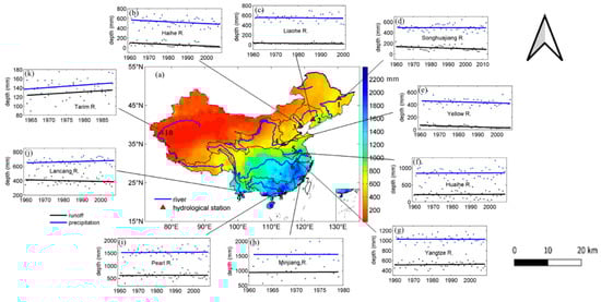 The spatial distribution of average precipitation and the temporal variability of annual precipitation (blue) and yearly river discharge (black) Subfigure (a–k) illustrate temporal variation in precipitation in different location across China precipitation (blue) and yearly river discharge (black) [20].