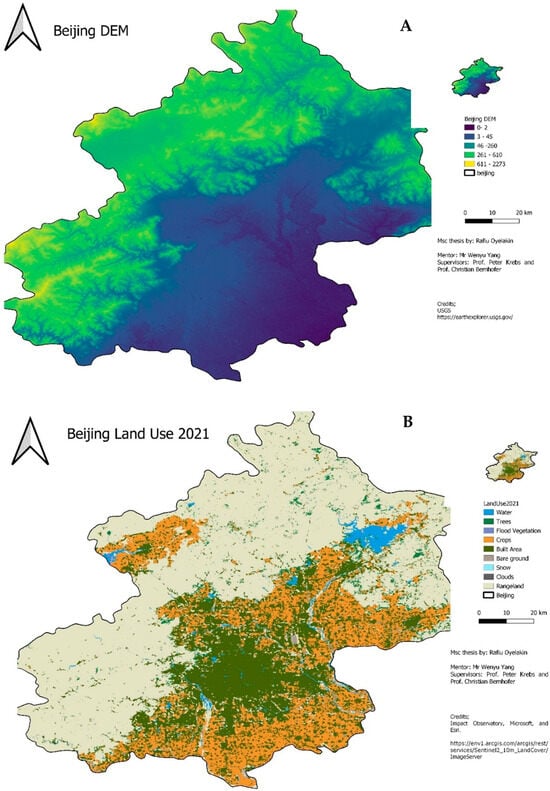 (A) is the digital elevation model of Beijing, and (B) is 2021 landuse, which was captured by Living Atlas.