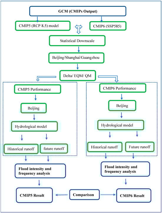 The urban runoff management infrastructure tends to lag behind urban expansion, and the occurrence and volume of city storm floods have rapidly risen [17], with many studies concluding that the impact of urban floods on life and socio-economic status is worse than before [5,15,18,19,20,21]. Flood events in China have been investigated by using web-based information to explore spatial and temporal trends, and it has been reported that almost 59.9% of China’s cities have been affected by a storm flood event, triple the amount that the government projected in 2011 [17]. The magnitude of flood impacts grew in the previous three decades, as a result of various physical, socioeconomic, and hydro-mereology factors [19]. Although GCMs potentially have great potential to capture this trend, their output is typically, as a result of spatial scale, too coarse to capture this change in urban areas. The downscaling approach is therefore necessary to convert large-scale GCM outputs to tailored regional scales of interest [22] Regional climate models (RCMs) have also been frequently employed in the downscaling GCM forecasts of future climate change scenarios. Downscaling techniques are divided into statistical and dynamic downscaling, namely RCMs [23,24]. Dynamical downscaling involves either performing a high-resolution restricted area model with GCM data as boundary conditions or conducting a “time slice” experiment [25]. The computing load imposed by the increase in resolution limits the practical implementation of dynamical downscaling. Measured long-term time series are used in statistical downscaling to build statistical correlations that involve local values and large-scale averages of surface variables. The statistics used might be basic or complex, but the ultimate correlations are usually determined by using some type of regression analysis [25] Statistical downscaling methods typically have broader applications because of their low computation efficiency and comparatively good performance [22]. The choice of statistical bias correction techniques is important because it affects the overall accuracy of downscale data.