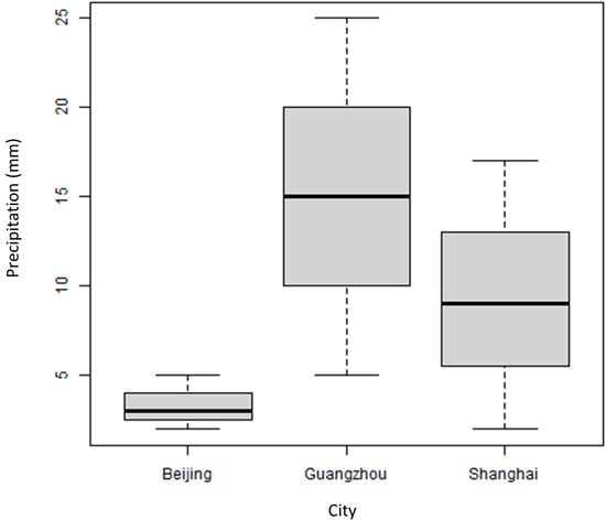The result of the statistical downscale of the three Chinese cities (Beijing, Shanghai, and Guangzhou) is presented in this section in Figure 5, which presents a boxplot bias that cuts across them. Beijing shows a strong alignment between the downscaled and observed data, in the upper, middle, and lower quantiles. The whisker is also the result of all divergence under 5 mm/day of precipitation. In Guangzhou, the result indicates a bias in the observed and downscale data, whose variation ranges from 1–16 mm/day of rainfall. The positive quantile has the highest precipitation variation of up to 10 mm/ day. The deviation was however relatively small in the lower quantile, at around 1 mm/day of precipitation. The difference in the middle quantile was found to be lower when compared to the upper quantile, and lower when compared to the lower quantile. Downscale precipitation for Shanghai is high when compared to Beijing, and low when compared to Guangzhou. While there is no signification variation in the lower quantile, the upper quantile has a deviation of up to 7 mm/day of rainfall.
