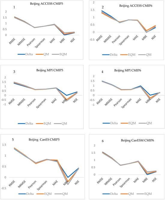 The result of the performance evaluation of the statistical downscale is presented in this section. Evaluation criteria were grouped into two sections. Section One consists of seven indicators (RMSE, NRMSE, Pearson, Spearman, MAE, MBE, and NSE), and only the result of Beijing is presented; Guangzhou and Shanghai, in contrast, are presented in the appendix. Similarly, the Taylor diagram for Beijing is discussed, and the other two cities are presented in the appendix. Figure 6 depicts the result of the delta, QM, and EQM bias correction techniques, and their performance evaluation index for the selected CMIP5 and CMIP6 GCM models. The result from ACCESS1-3 (Figure 6 subplot 1 & 2), and a closer look at the delta method of downscale, indicates an improvement in CMIP6, compared to CMIP5. The RMSE, NRMSE, MAE, MBE and NSE change from 1.58, 1.32, 0.96, 0.01, and 0.221 in CMIP 5, respectively; and from 1.35, 1.07, 0.79, 0, and 0.307 in CMIP6, again respectively. In the QM, a similar observation was made about the downscale.