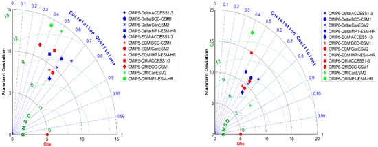 Similar to the result of CMIP6, which showed a quite striking improvement in GCM output, the CanESM2—QM, ACCESS—EQM, CanESM2–EQM, BCC-CSM1—EQM, CanESM2—Delta, BCC-CSM1—QM, ACCESS1-3—Delta, and BCC-CSM1—Delta all recorded correlates greater than 0.60. The CanESM2—QM has a minimum RMSD deviation of 2 in the observed data, while MPI-ESM-HR QM has a maximum RMSD value of 15.