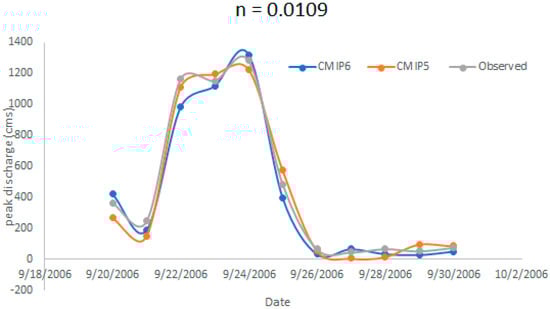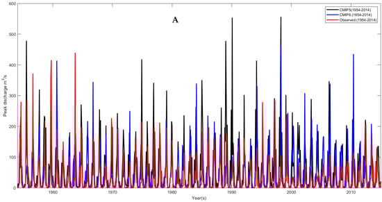 The result of the hydrological m analysis of future projected scenarios between 1954 to 2015 in the CMIP5, CMIP6, and observed data are presented in Figure 9. The CMIP5 projection overestimated precipitation, while the CMIP projection was close to the measured data.