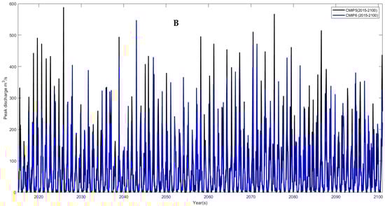 The result of the statistical analysis of future projected scenarios between 2015 to 2100 in the CMIP5 and CMIP6 are presented in Figure 10A,B, for CMIP5 and CMIP6, respectively. The low runoff event is filtered from the timeseries.