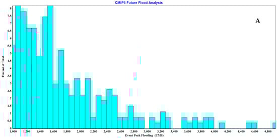 A threshold of 1000 m3/s was introduced to exclude events with low runoff event from the base case (the measured data), and to simulate cases for the historical and future projection based on CMIP5 and CMIP6 scenarios [62]. Events above this threshold were classified as extreme events. The extreme event was further analyzed based on the percentage composition that exceeded certain thresholds in the historical period of 1954 to 2014, for both CMIP 5 and CMIP6. The event was dominated by flooding of 2000 m3/s. A total of 25% of the events fall under 1200 m3/s; another 25% of the events fall under 1400 m3/s; and 32.5% of the events are in the range of 1400 m3/s and 2000 m3/s. Events with 2800, 3000, 3200, 3400, 4600, and 5200 m3/s each constituted 1% of the catastrophe events.