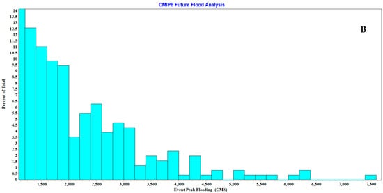 A total of 186 events were identified, with a range between 1000.929 and 5833.825. Most of the events were characterized by 1800 m3/s, although an event with a magnitude of 5833.8 m3/s emerged from an observed historical case. A total of 38% of events are due to flooding less than 1400 m3/s, while nearly 41 of the 186 events were due to runoff in the range of 1400–1800 m3/s. In contrast, the CMIP6 event has a total of 86 events, which is, when compared to the CMIP5, quite close to the number of events in the observed case. Also, most events were dominated by a 1800 m3/s flood. Interestingly the percentage of events characterized by 3200 m3/s flood increased from 0% in both cases (to 4% in the CMIP6).