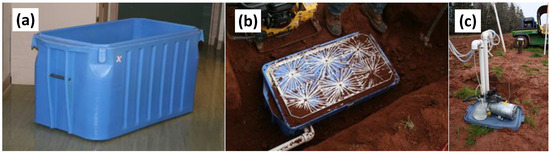 The quantity and quality of the water leaving the soil profile was sampled using Passive Capillary Samples (PCAPs) (Figure 2). A total of 8 PCAPs (6 in Section A and 2 in Section B) were installed at 60 cm below the ground surface and were sampled on a monthly basis. The sampling was less frequent during summer, due to the limited amounts of drainage water, and occasionally more frequent during spring, when increased drainage led to two sampling dates per month. PCAPs consist of plastic bins with a maximum capacity of ~300 L (0.8 L × 0.45 W × 0.8 H m), with 6 clusters of fiberglass wicks placed at the top of each PCAP lid (Figure 2). PCAPs were constructed on-site by adapting the design proposed by Louie et al. (2000) [46] and Jabro et al. (2007) [47]. The bins were buried in the field, and underground sampling lines were installed through 3″ PVC pipes, with sampling ports located in areas where they would not interfere with agricultural operations (i.e., sampling nests). The sampling ports were raised to about 60 cm aboveground so they were accessible during the winter months (Figure 2).