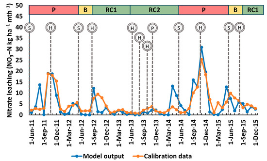 Monthly NO3–N leaching for Section A: model output vs. calibration data (S—seeding, H—harvesting, P—red clover plowed).