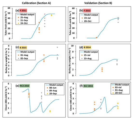 Comparisons between model output (lines) and measured data (dots) for selected crop parameters and years. (a) Potato (2011); (b) Potato (2013); (c) Barley (2015); (d) Barley (2014); (e) RC2 (2010); (f) RC2 (2015) (for barley, the biomass included total biomass for the first sampling date of the season and the sum of kernels and straw for the second sampling date of the season; ABG—aboveground biomass; for a given sampling date, each measured data dot represents a different location within the field).