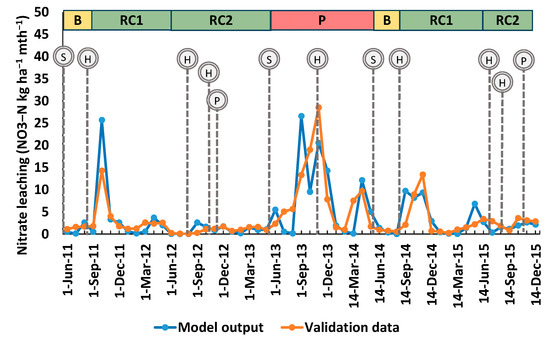 Monthly NO3–N leaching for Section B: model output vs. validation data (S—seeding, H—harvesting, P—red clover plowed).