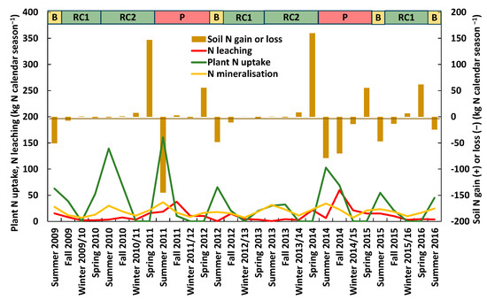 Calendar season averages of main soil N budget terms for the study period (2009–2016).