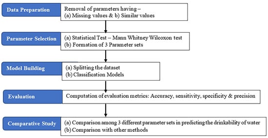 Our proposed method for predicting water quality begins with a pre-processing phase. This is followed by identifying the most crucial parameters that determine water quality. We then classify samples into categories of drinkable and non-drinkable water. Finally, we evaluate the performance of our designed system to ensure its effectiveness. The flow of the proposed methodology is provided in Figure 1.