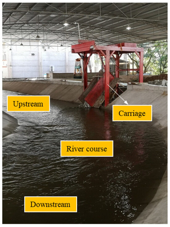 The landslide surge model test was conducted at the National Engineering Research Center for River Channel Regulation Engineering of Chongqing Jiaotong University. The model selected a typical bend section in the Three Gorges Reservoir area of the Yangtze River as the prototype. The research team conducted model design, computer mapping, and physical construction according to a normal scale of 1:70. The model tank centerline was 60 m long, with a top width of 8.0 m, a bottom width of 2.94 m, a height of 1.6 m, a bend center angle of 90 degrees, and a tank bottom slope of 1.5‰. The slopes on both sides of the water tank were taken as the average slope of the mainstream of the Yangtze River at the Three Gorges Reservoir area, with average slopes of 30° and 20° on the left convex bank and right convex bank, respectively. A chute with an adjustable sliding surface angle and landslide volume was placed on the left bank of the river channel, and multiple high-speed cameras were installed at different positions in the tank to track and record the multi-stage motion process. The frame rate of the camera was set to 100 fps. The physical model of the river channel is shown in Figure 1, and the layouts of the carriage and chute are shown in Figure 2 and Figure 3. Compared with the original physical model test of straight-channel landslide surges under static water conditions, this bend section tank model considered the impact of water flow dynamics on landslide surge, which could better simulate the mechanism of landslide surge under a complex water environment and its impact on navigation safety.