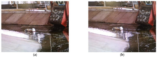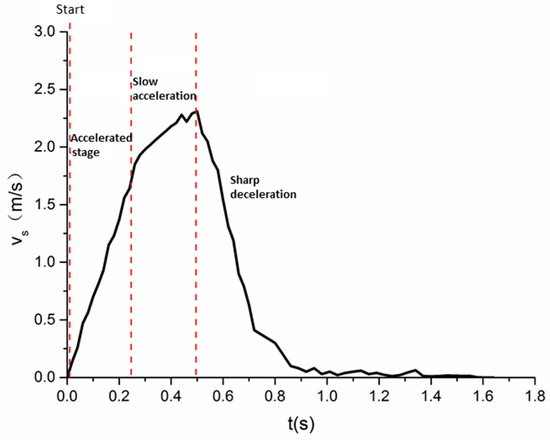 During each test, blocks of different sizes were arranged according to the distribution of the cracks; then, the parameters were adjusted according to the model test conditions. The landslide began to move and entered a data collection state. After the instrument had completed the collection record, the testing of this group was completed. The high-definition video screenshots of the landslide movement process taken during the M10 model test were selected, and the variation in the landslide movement speed was analyzed over time, as shown in Figure 8 and Figure 9. From the figures, it can be seen that the motion process of the simulated landslide in the experiment was similar to the motion characteristics of the four stages of the landslide mentioned above.