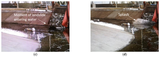 The third stage: during the sliding process, the center of gravity of the landslide gradually decreased, energy was gradually consumed, and the sliding speed gradually decreased before reaching motion balance until the front edge of the landslide was about to impact the water surface. This was the stage of slow acceleration or deceleration (Figure 8c).