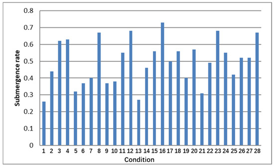 In this study, the inundation volume of a landslide mass was measured and calculated under 28 experimental conditions, with the inundation rate for each condition calculated according to Equation (1). The results are shown in Table 2 and Figure 11. From this, it was found that the landslide inundation rates under all experimental conditions were 0.25~0.75, and the relatively concentrated inundation rate was 0.35~0.65. The landslide surge tests in this study were not completely submerged deep-water landslide surge tests but related to the shallow-water landslide surge test.