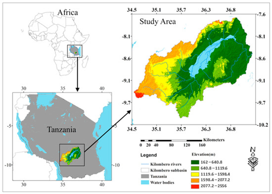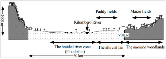The current assessment focused on the hydrologic boundaries of the Kilombero River Catchment (Figure 1), which is part of Tanzania’s largest hydrologic basin, the Rufiji River Basin (RRB), spreading across 177,420 km2 (about 20% of Tanzania’s land mass). Kilombero River catchment in particular extends between longitudes 34°00′ E–37°20′ E and latitudes 07°40′ S–10°00′ S and covers an area of approximately 40,000 km2 [33]. The cross-section of the catchment (Figure 2) is characteristic of a graben structure, with the Udzungwa mountain ranges and Mbarika escarpments forming the northerly and southerly crests, respectively, while the middle part (the flood plain) forming the trough extending around 1967 km2 [39,40]. This middle part constitutes one of the largest wetlands in East Africa, i.e., Kibasira wetland, which is at around 300 m above mean sea level [41], and most of its area is internationally designated as a Ramsar site for its environmental significance [42]. Kilombero River catchment is the most important catchment with respect to agriculture, energy production, natural resources, and flow to RRB [42]. Tributaries contributing to the Kilombero River catchment are Lumemo, Luipa, Mngeta, Kihansi, Mpanga, Mnyela, Ruhuji, and Furua. Most areas of KRC are situated in the administrative region of Morogoro, where its most developed center (Ifakara) is found some 400 km from Dar es Salaam.