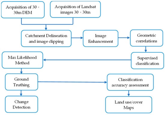 The study employed GIS and RS techniques to carry out land use/cover assessments. This started with the acquisition of geospatial data and subsequent image processing and analysis. Figure 3 below shows a methodological chart to simplify visualization of the process undertaken in this study.