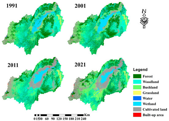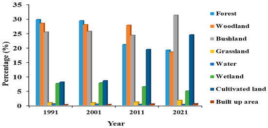 The areas under different land use/land cover types and percentages are given in Table 5. The land use/land cover percentage graphs and maps for the years 1991, 2001, 2011, and 2021 are presented in Figure 4 and Figure 5, respectively. Table 5 shows that land use/land cover for the year 1991 was dominated by forest (1,192,996 Ha) followed by woodland (1,141,382 Ha), bushland (1,019,128 Ha), cultivated land (321,188 Ha), wetland (302,098 Ha), grassland (34,067 Ha), water (18,641 Ha), and built-up area (7437 Ha). For the year 2001, land use/land cover was dominated by forest (1,177,109 Ha), woodland (1,121,891 Ha), bushland (1,029,224 Ha), cultivated land (340,472 Ha), wetland (311,029 Ha), grassland (33,500 Ha), water (15,075 Ha), and built-up area (8615 Ha). Moreover, the dominant land use/land cover for the year 2011 was woodland (1,114,763 Ha), followed by bushland (972,794 Ha), forest (844,527 Ha), cultivated land (776,118 Ha), wetland (256,250 Ha), grassland (44,310 Ha), built-up area (19,331 Ha), and water (11,578 Ha). For the last year of the study period, i.e., 2021, the dominant land use/land cover was bushland (1,253,491 Ha) followed by cultivated land (980,534 Ha), forest (766,835 Ha), woodland (714,798 Ha), wetland (196,912 Ha), grassland (67,614 Ha), built-up area (19,331 Ha), and water (10,419 Ha).