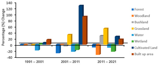 The changes in land use/land cover for the study periods of 1991–2001, 2001–2011, and 2011–2021 are given in Table 6 and illustrated in Figure 5 and Figure 6. During the study period 1991–2001, woodland experienced a maximum decrease of 19,492 Ha, followed by forest (15,887 Ha), water (3546 Ha), and grassland (567 Ha), while a maximum increase was observed in cultivated land (19,284 Ha), followed by bushland (10,096 Ha), wetland (8932 Ha), and built-up area (1179 Ha). The maximum annual decrease was observed in woodland (1949 Ha), followed by forest (1589 Ha), water (355 Ha), and grassland (57 Ha), while the maximum annual increase was observed in cultivated land (1928 Ha), followed by bushland (1010 Ha), wetland (893 Ha), and built-up area (118 Ha). During the study period 2001–2011, the results showed an increase in cultivated land (435,710 Ha), grassland (10,810 Ha), and built-up area (7916 Ha), while a decrease was observed in forest (332,582 Ha), bushland (56,430 Ha), wetland (54,779 Ha), woodland (7128 Ha), and water (3517 Ha). Furthermore, a maximum annual decrease was observed in forest (33,258 Ha), followed by bushland (5643 Ha), wetland (5478 Ha), woodland (713 Ha), and water (352 Ha), while a maximum annual increase was observed in cultivated land (43,571 Ha), grassland (1081 Ha), and built-up area (792 Ha). During the study period 2011–2021, a maximum increase was observed in bushland (280,698 Ha), followed by cultivated land (204,353 Ha), grassland (23,304 Ha), and built-up area (2800 Ha), while a maximum decrease was observed in woodland (372,965 Ha), followed by forest (77,692 Ha), wetland (59,338 Ha), and water (1159 Ha). Moreover, a maximum annual decrease was observed in woodland (37,297 Ha), followed by forest (7769 Ha), wetland (5934 Ha), and water (116 Ha), while a maximum annual increase was observed in bushland (28,070 Ha), followed by cultivated land (20,435 Ha), grassland (2330 Ha), and built-up area (280 Ha).