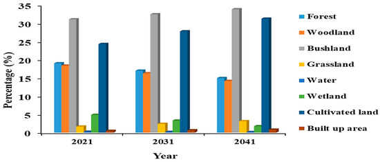 The projected changes in land use/land cover for the periods 2021–2031 and 2031–2041 are given in Table 12 and illustrated in Figure 9. It is expected that from 2021–2031, woodland will experience a maximum decrease of 84,751 Ha, followed by forest (81,596 Ha), wetland (63,015 Ha), and water (2260 Ha) while maximum increases will be observed on cultivated land (139,862 Ha), followed by bushland (55,757 Ha), grassland (29,416 Ha), and built-up area 6587 Ha). The maximum annual decrease is expected in woodland (8475 Ha), followed by forest (8160 Ha), wetland (6302 Ha), and water (226 Ha), while the maximum annual increase is expected in cultivated land (13,986 Ha), followed by bushland (5576 Ha), grassland (2942 Ha), and built-up area (659 Ha). Moreover, for the projected changes for the period 2031–2041, a maximum decrease is expected in woodland (85,241 Ha), followed by forest (81,931 Ha), wetland (62,606 Ha), and water (2131 Ha), while a maximum increase is expected in cultivated land (13,979 Ha) followed by bushland (55,672 Ha), grassland (29,624 Ha) and built-up area (6824 Ha). The maximum annual decrease is expected in woodland (8524 Ha), followed by forest (8193 Ha) and wetland (6261 Ha), while a maximum annual increase is expected in cultivated land (13,979 Ha), followed by bushland (5567 Ha), grassland (2962 Ha), and built-up area (682 Ha).