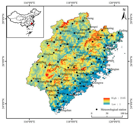 The location of the study area and the distribution of meteorological stations in Fujian Province.